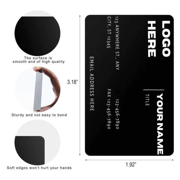 Personalized black aluminum metal business cards, size: 3.18″w x 1.92″h x 0.01″(0.2mm) thickness, one side or two sides.