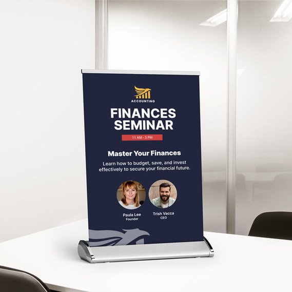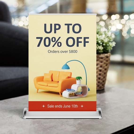 Tabletop retractable banners are a classy way to display messages right at your desk. They’re made of A3-sized vinyl on a metal structure with a sturdy foundation. The retractable table banner stands can be rolled up and packed for easy transportation. Our tabletop retractable banner is coated with ultraviolet inks for longevity. It can be displayed on desks at the office or on counters and podiums at different event venues. These miniature displays are an asset to business events that have limited space and can’t accommodate full-sized retractable banners. A tabletop retractable banner is portable, easy to assemble and perfect for tight spaces. The stands are compact but display eye-catching graphics with full color inks.